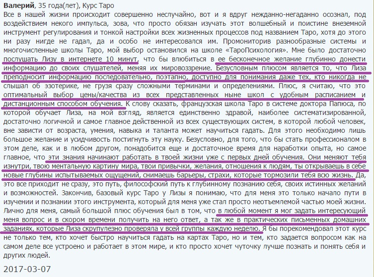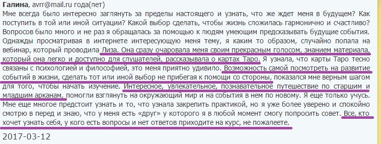 Опыт. Провела свыше 3000 консультаций; ученики и клиенты из 17-ти стран мира, более 500 человек освоили искусство Таро (из них 60% используют Таро как дополнительный источник дохода).
